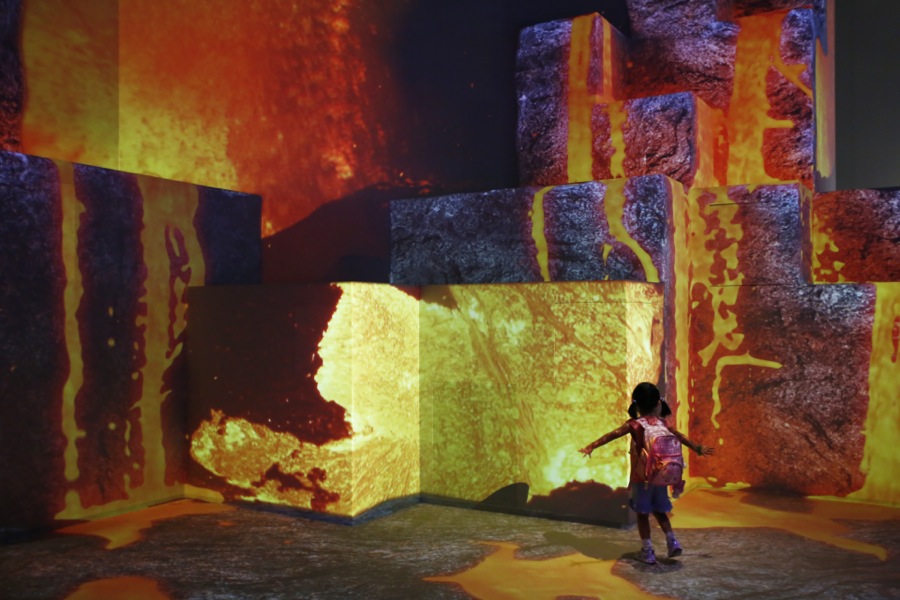 エキシビションゾーンの中心には、大きなブロックが積まれたアメニティスペース「ベースキャンプ」が。プロジェクションマッピングを駆使し、壁面に火山や滝、ジャングルなどが表れる。CGで現れる動物や流れ出すマグマに直接触れるかのような感覚は、子どもたちにとって非常に興味深いものかも。