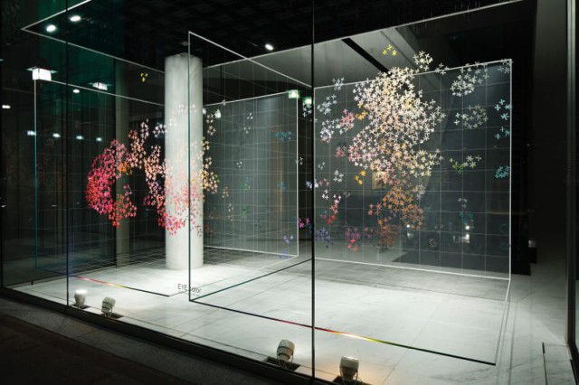 また、1階のウィンドーディスプレーは「2014AW=(x/150)(x/135) 未来の美しい色を求めよ。」がテーマ。多数のヘアメイクアーティストが所属する資生堂ビューティークリエーション研究センターが、トレンド予測の知見から導き出した2014年秋冬のカラートレンドと、最新科学を追究する資生堂リサーチセンターの色嗜好調査で使用しているリップ150色、アイシャドー135色をかけあわせ、美しくプロット。2014年秋冬のリップとアイシャドーのトレンドカラーを分析した、3次元グラフそのものを資生堂のイラストレーションからインスパイアされた空想の色花で鮮やかに表現されている。