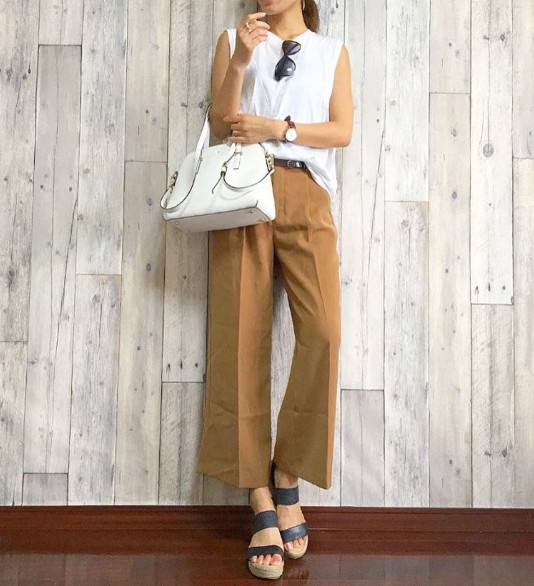 顔映りがキレイなベージュはトップスにはもってこいです。肌とカラーリンクして、二の腕も強調されないので、上半身をスッキリとした印象に見せることができます。