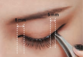 (11)目頭から8mm離れたところから、目尻の約5mm外側までつけまつげFをつける(接着剤が乾いて白く残ってしまったらEで黒く塗る)