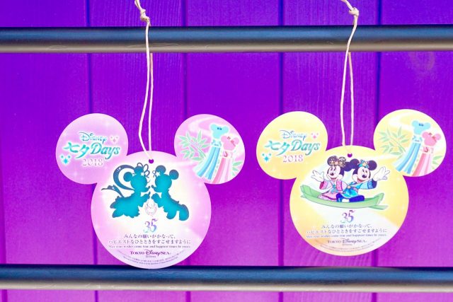 さらには七夕ならでは、ミッキーマウスをかたどった吹き流しや笹が飾られた「ウィッシングプレイス」が両パークに登場。七夕の雰囲気を一層盛り上げています。浴衣を着たキャストたちが配っているウィッシングカード(短冊)に夢や願い事を書いて結びつけましょう。