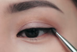 反対の手の人差し指でまぶたを持ち上げ粘膜を出して、黒のジェルアイライナーでしっかり粘膜を埋めた後、まつげ根元の隙間を埋めながらアイラインを描きます。