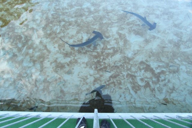 最も驚きなのが屋外にある25mプール。プールの底には海の砂が敷き詰められているのですが、そこで泳ぎ回っているのはサバなどの魚たちだけではありません。なんとウミガメやシュモクザメも同じ場所で泳いでいるのです。