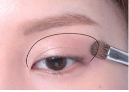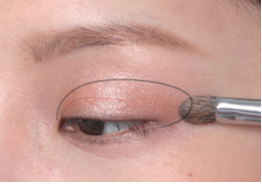 淡くパールの入ったプラムブラウンカラーのシャドウを目を開けた状態で目の際にポイントブラシを入れ込むような感じでのせます。黒目の中央(点線)を超えないように注意しながら、目尻から目頭の方向にのせるのがポイントです。