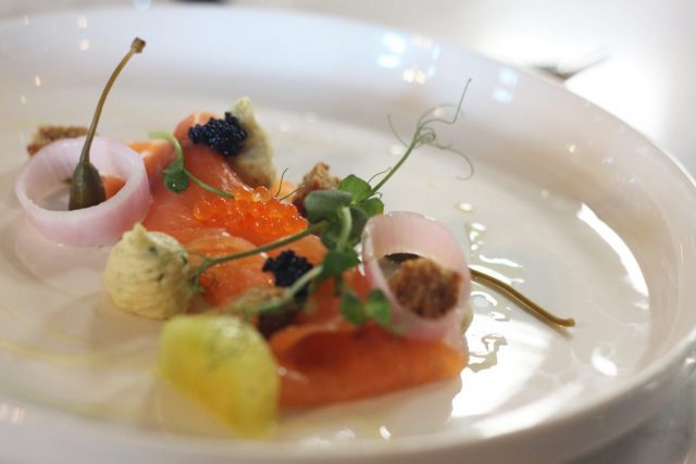 先ほど紹介したプローンカクテルと同じく、前菜はサーモンやイクラなどの海産物が一般的。こちらでは「ローストサーモンの前菜」をいただきました。