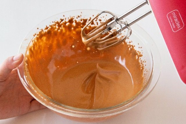 (2)インスタントコーヒーがきちんと溶けたらハンドミキサーを使って泡立て、5~10分かけて白くもったりとしてツノが立つまで泡立てる