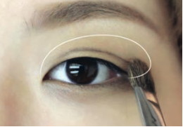 二重ラインの外側(上)に、ダークブラウンのアイシャドウをシェードブラシでのせます。目をすこし伏せた状態にして二重ラインの内側(下)に入らないように注意しましょう。また、上にいくほど色が薄く出るようするのがポイントです。