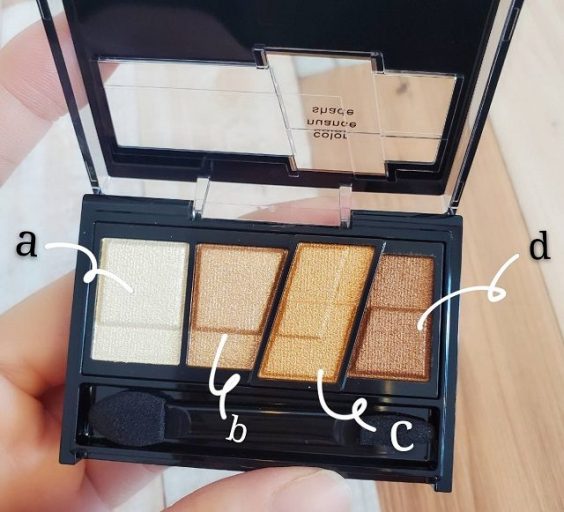 bをブラシに取り、アイホール全体にまるく塗り、続けてcをアイホールに重ねて奥行きを出していきます。cはゴールド感が強めなので、アイホールの真ん中を意識的に多めに重ねるのがポイントです。