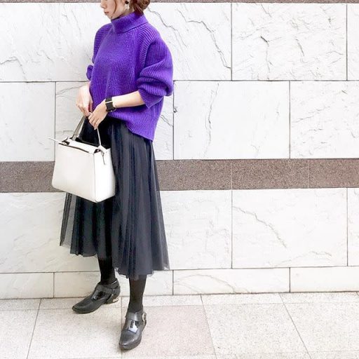シフォン素材のブラウスをインナーに合わせて軽やかさを出すことで、重めのタートルニットでも上品きれいめな印象に。レイヤードするアイテムによっても印象が大きく変わるので、バリエーションを揃えておくことが着回し幅を広げるポイントです。