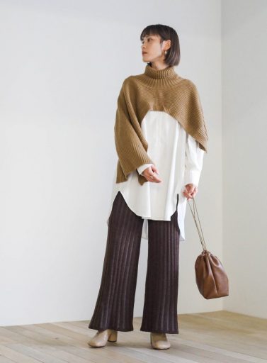 旬度高めのレイヤードスタイルを実現してくれるアシンメトリーデザインのケープニットも要チェックの1枚です。