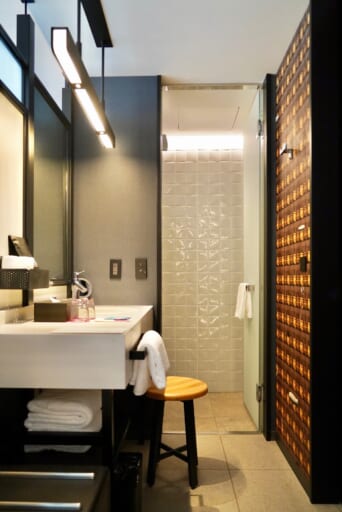 ▲洗面台やクローゼット、アメニティはシンプルなデザイン。なお、「サヴィーキング」の客室にはバスタブはなく、レインシャワー付きのシャワールームのみとなります