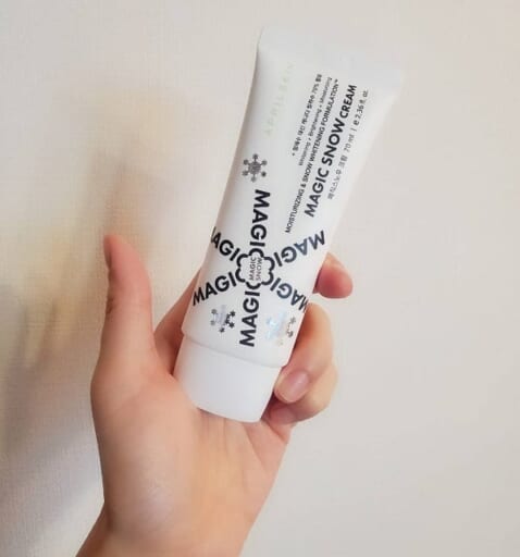 トーンアップ下地といえば少し固めのテクスチャーが多い中、APRIL SKINの「MAGIC SNOW CREAM」は伸びが良く、しっとりした付け心地で評価の高いクリームです。