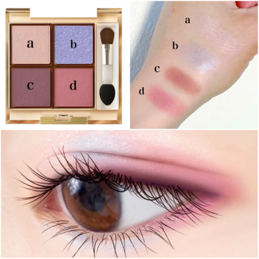 ▲d(サンキャッチャー)とc(ローストナッツ)のグラデーションを上まぶたにのせ、下まぶたにb(シアーライラック)をふんわりとのせれば、トレンド感たっぷりな目元が完成