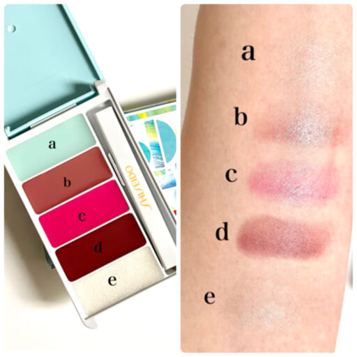 未来の海を守るためのこだわりが詰まった、みずみずしい透明感がありながらも美しい発色が魅力の5色のリップカラーパレット。下地としても使えるリップベース(a)、リップカラーバーム(b)、リップティント(c)、リップカラー(d)、ニュアンスチェンジできるリップパール(e)とこれ1つで様々なリップメイクが愉しめます。