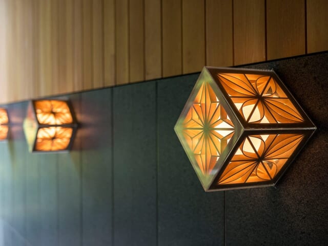 ▲大浴場の照明には、400年の歴史を誇る栃木県鹿沼市の鹿沼組子が使われます。日光東照宮造営の際、全国から集まった職人が技術を伝えたと言われる木工細工です