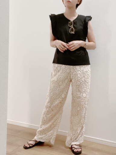夏らしさたっぷりの今季トレンドのクロシェ編みの白パンツに、フリルTをあわせたの甘めアイテムを合わせたコーデ。このようなときは、サングラスやビーチサンダルなどのカジュアルアイテムを採り入れるだけで、バランスが取れて甘くなり過ぎずに着こなせます。