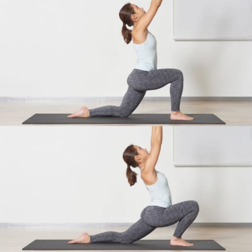 終わったら脚を変えて反対側も同様に実践します。なお、期待する効果をきちんと得るためには「股関節周り、お腹周り、前脚の前もも、後ろ脚の太もも裏の伸びをしっかり感じること」がポイント。つい各パーツを伸ばすことに意識が向き過ぎて、後ろ脚が伸びていない状態(下写真上)、前脚のひざがつま先より前に出た状態(下写真下)にならないように注意しましょう。