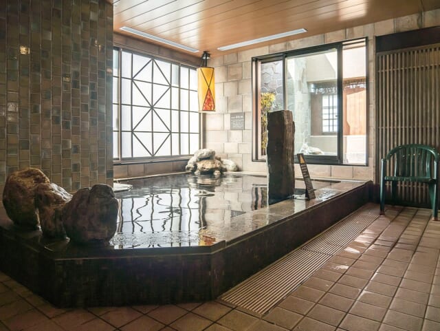 大浴場の内風呂に満たされた天然温泉は、千葉県匝瑳市の「あ・うんの湯」からの運び湯です。源泉はpH8.23の弱アルカリ性冷鉱泉。しかも湯船の底が見えないほど琥珀色で、湯冷めしにくくポカポカ温まるお湯となっています。