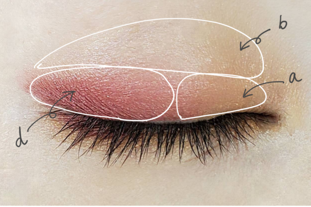 下まぶたにbを入れた後、下まぶたの目頭にaをのせて目元を明るく見せましょう。また、下まぶたの目尻にdをのせると赤味が出て、うるみ目効果を得られます。ポイントは横幅を出すように意識して、グラデーションっぽくカラーをのせること。ナチュラルに目を大きく見せましょう。