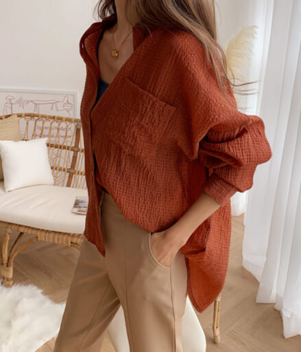 ゆるっとしたシルエットのシャツはリラックス感がありながら、きちんと感を損なうことがないのが魅力。シックな色味を選んで秋らしさを演出するのがポイントです。