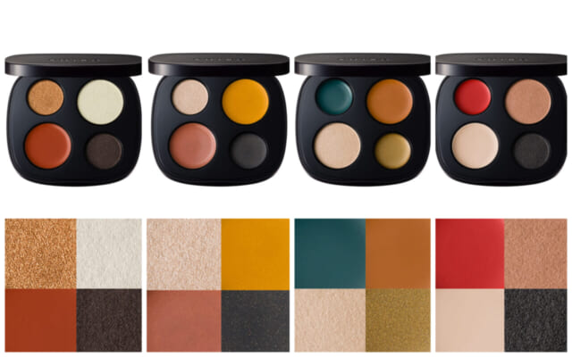 パッケージをスリムなデザインへと変更することで使用するプラスチックの量を減らし、指で馴染ませやすい質感に仕上げることで付属のブラシがなくなりました。それぞれのパレットによって、色に合わせたパウダータイプやクリームタイプなどが組み合わされており、ポイント使いや広い部分に使うカラーごとに量が調整されているので、最後まで使い切りやすいのも魅力。パレット内の4色は、スタイリッシュで使いやすい3色とアクセントカラーの1色がセットされており、多彩な目元の表情作りが楽しめます。
