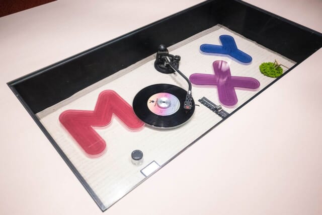 ▲ラウンジのテーブルにはめ込まれたフェイクのレコードプレイヤーは、よく見ると竜安寺を思わせる枯山水! 京の伝統とアメリカナイズされたユーモアが、ここでもミックスしています