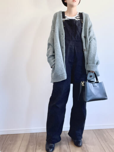 あとはお尻が隠れるくらいの丈感のざっくりカーディガンをオンするだけで、今の時期にピッタリなコーデが完成。カジュアルなアイテム合わせのときは、首周りをスッキリさせることでオンナらしさを演出しましょう。