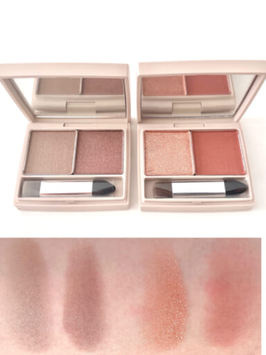 「01 スプリングトープ」は、やわらかさと立体感を目元に与えてくれてアイシャドウベース的にも使えるマットなトープカラーと、まぶたの際の締め色や重ねて深みを出すときもつやめく透け感で軽やかな印象に仕上げるシマーなダークブラウンの2色セット。「02 ローファイア」は、ベースカラーや締め色に使いやすいやわらかな赤みのマットなウォームブラウンと、粒感のあるパールが華やかさとクールな強さを演出してくれるシャイニーなブロンズスパークルシャドウがセットされています。肌にしっとりと馴染み、重ね付けしても粉っぽさや厚みのない深みを増した心地よい抜け感が特徴です。
