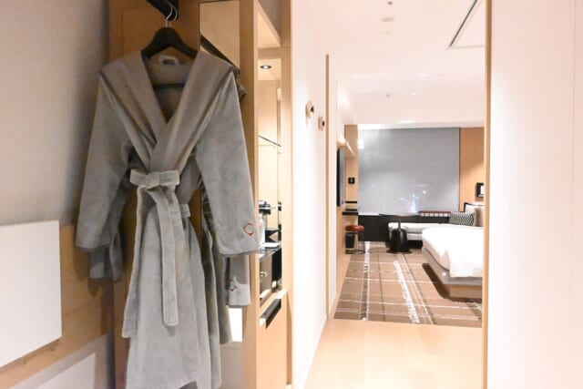 ▲オープンクローゼットは使い勝手がよく、客室スペースがより広く感じられます。また、ハイアットのロゴがプリントされたミネラルウォーターは、再利用のできるアルミボトルです