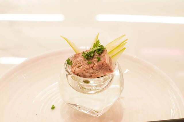 アミューズは小さなガラスの器に乗ったパテ。コクのあるパテは塩味もちょうどよく、添えられた青りんごが口をさっぱりとリセットします。
