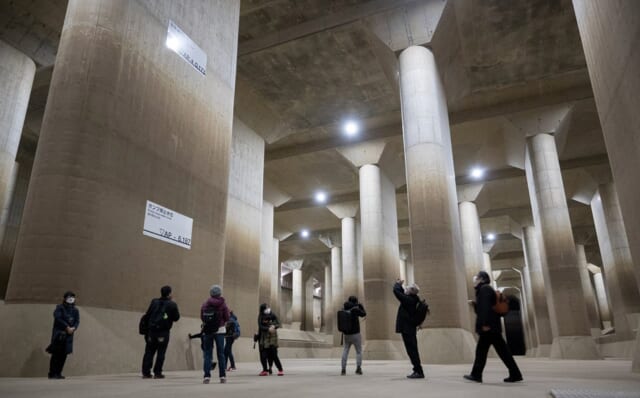 地下神殿は地下22mに作られた、奥行き177m、幅78m、高さ18mの巨大な水槽で、ポンプを運転するための水深と水量を確保します。さらに、増水した川から流れ込んだ水は、この調圧水槽で勢いを弱め、江戸川へと放出されます。