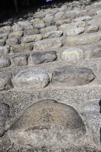 ▲冠山の南側にある石段には「潔」と彫られた石がある。どんな意味があるのか不明な、ナゾ石です