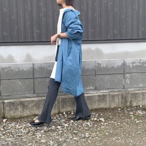 デニムのシャツワンピは「重く見えそう」な印象もありますが、襟抜きで着こなしつつ、トレンドのフレアパンツを合わせるだけで大人っぽく仕上がり、スタイルアップも叶います。