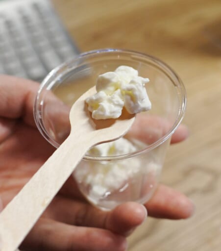 運がよければ試食もできます。ツアー参加者だけの特別サービスで、新商品や、普段はなかなか食べられないチーズなどが試せるかも。写真はこの日仕込んだモッツアレラチーズの元。翌朝まで発酵させる途中の、滅多に食べられない試食でした。