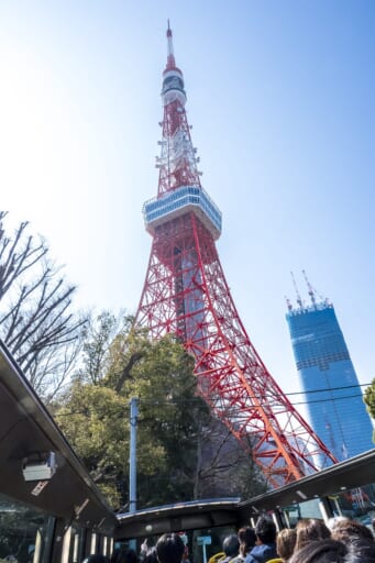 ▲迫力の瞬間! バスが間近を通るので、空を振り仰ぐように東京タワーを見られます