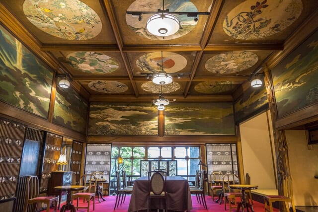 4番目の部屋は、日本画家磯部草丘(そうきゅう)による欄間絵と天井画が描かれた「草丘の間」。繊細な花鳥図が描かれた天井画に加え、力強い松の木とパノラミックで雄大な松林を描いた欄間絵。1人の画家が描いたとは思えないダイナミックな対比を楽しめます。