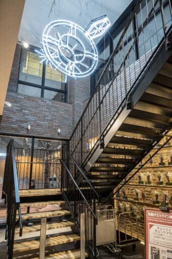 ▲1階ロビーから2階レストランへと続く階段ではネオンに注目