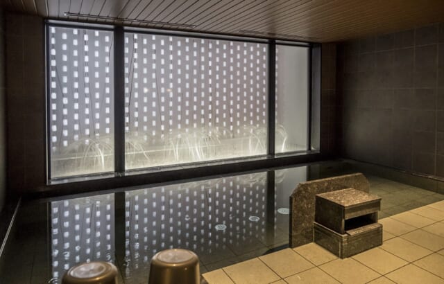 浴槽から望む坪庭は、すすき野という地名にも残るように、入植前はススキの野原だったと言われる札幌の原風景をイメージ。金属アートを製作する中林丈治氏が、ススキに模した作品「風標(かぜしるべ)」を飾ります。湯船から、開拓以前の北海道に思いを馳せてはいかがでしょう。