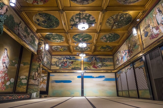 ▲純金箔などで仕上げた絵と彫刻が施された「漁樵の間」。煌びやかで絢爛豪華な造りに圧倒されます