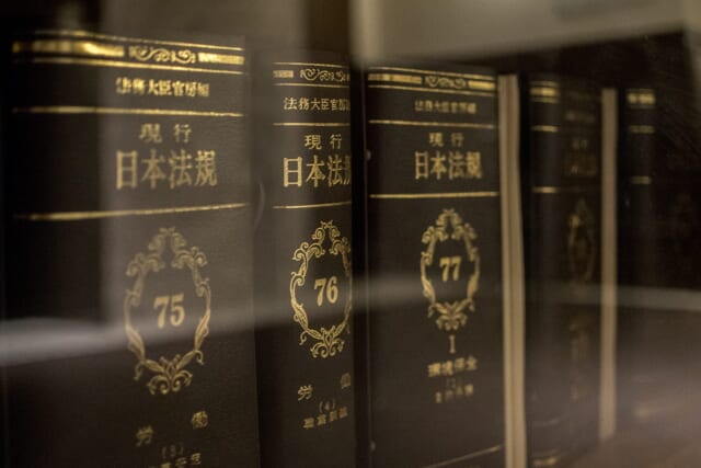廊下の書棚には、初版発行以来70年間改定し続けている日本の総合法規集「現行日本法規」が納められ、歴史の重みを醸します。