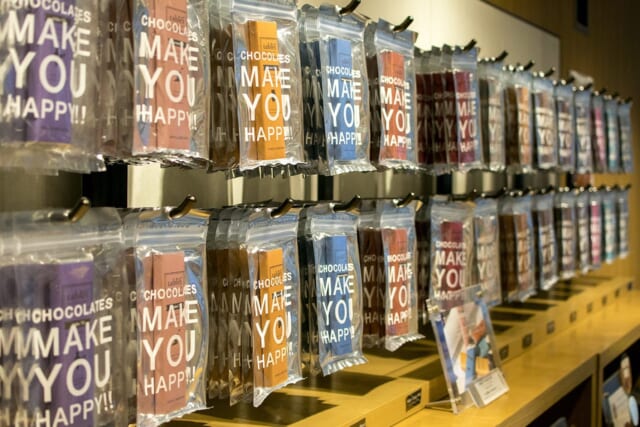 「タブレットショコラ」は、「ブラジル65」、「トリニダード77」、「ガーナ80」という具合いに、単一種類のシングルビーンを使い、カカオの含有量にこだわった板チョコ。産地がちがうカカオの味を楽しめるシングルビーンと、豆を組み合わせたオリジナルブレンド、「ほうじ茶」や「ソルト」などのフレーバーチョコをそろえます。
