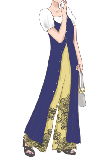 シャツを羽織りとして襟抜きで合わせてこなれ感を演出。シャツは柔らかいリネン素材や透け感のあるシースルー素材を選ぶと、よりトレンドライクな雰囲気に見せることができます。足元は細目の紐のサンダルで華奢っぽさをプラスすればナチュラルな色気を醸すのがポイントです。
