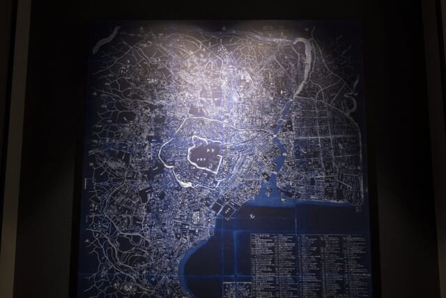 ▲1階エレベーターホールに架かる、清水慶太氏による古地図風アート「EDO,rotated90°」