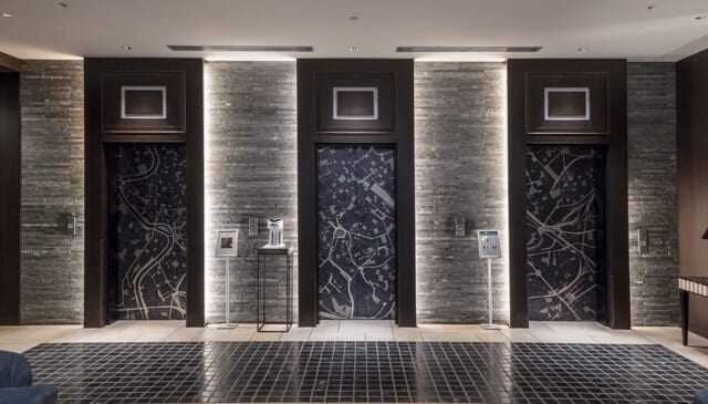 各階のエレベーターの扉は、ミラノ、ローマ、フィレンツェ、ベネチアといったイタリアの都市地図がモチーフ。偶数階がフィレンツェ、奇数階がベネチア、最上階がミラノで、コロッセオやドゥカーレ宮殿など各都市の特徴的な建物を中心に表現しています。