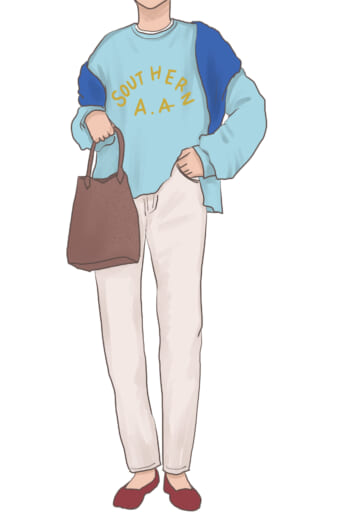 スウェット自体は長く着れるアイテムなので何枚あってもいいのですが、買い足すなら明るめのニュアンスカラーのロゴ入りスウェットを。見慣れたコーデもこなれ感のある雰囲気に仕上がります。