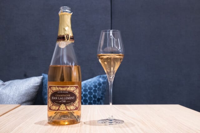 ▲「なにわ串キュイジーヌ」の乾杯酒として、甲殻類や魚介の味に合わせたロゼのシャンパーニュ、ジャン・ラルマンのレゼルヴ グランクリュをペアリング