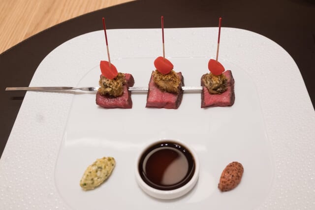 3種類のソースを味くらべする「牛肉-牡蠣」は、ローストビーフと牡蠣を串焼きで表現。それぞれ個性のあるソースが、牛肉と牡蠣の奥深い味わいを彩ります。