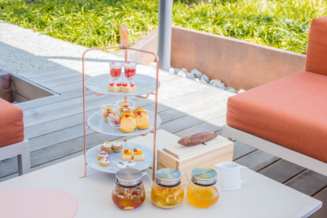 緑豊かなガーデンエリア「みやぐりん」のテーブル席で、アウトドアのアフタヌーンティーを楽しめます ※雨天はOMOカフェ&バルでいただきます