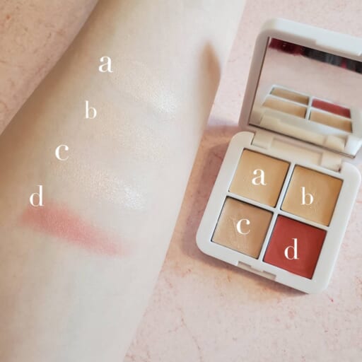 使い方も簡単で、a、bで肌を整えたあとはブランドの中でも1番の人気を誇るcの「シャンパンゴールド」のルミナイザーをハイライトとして肌にのせるだけ。