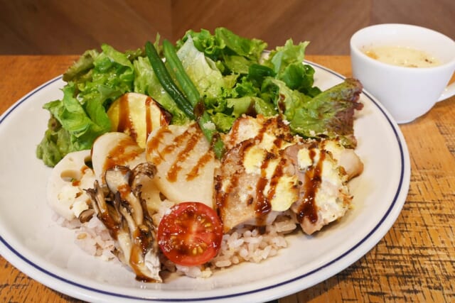 たっぷりの野菜に雑穀ご飯。ヘルシーな「チキンの香草パン粉焼きバルサミコビネガーソース」は、表参道限定メニュー。タルタルソースや香草パン粉が振りかけられたローストチキンと、蕪や蓮根、サツマイモなど秋野菜のグリルは、バルサミコソースでいただく多彩な味。リーフサラダはレモンドレッシングでさっぱり。ボリュームのあるチキンとたくさんの野菜がうれしいメニューです。